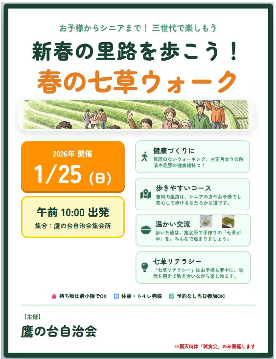 新春イベント「春の七草ウォーク」 福祉文化部 2026.01.112026.01.12 1月25日(日)開催予定です。ぜひご参加下さい。申し込みは、下の「参加登録フォーム」からお願いします。なお、申し込みの締め切りは、1月22日までとさせていただきます。【参加登録フォームはここから】